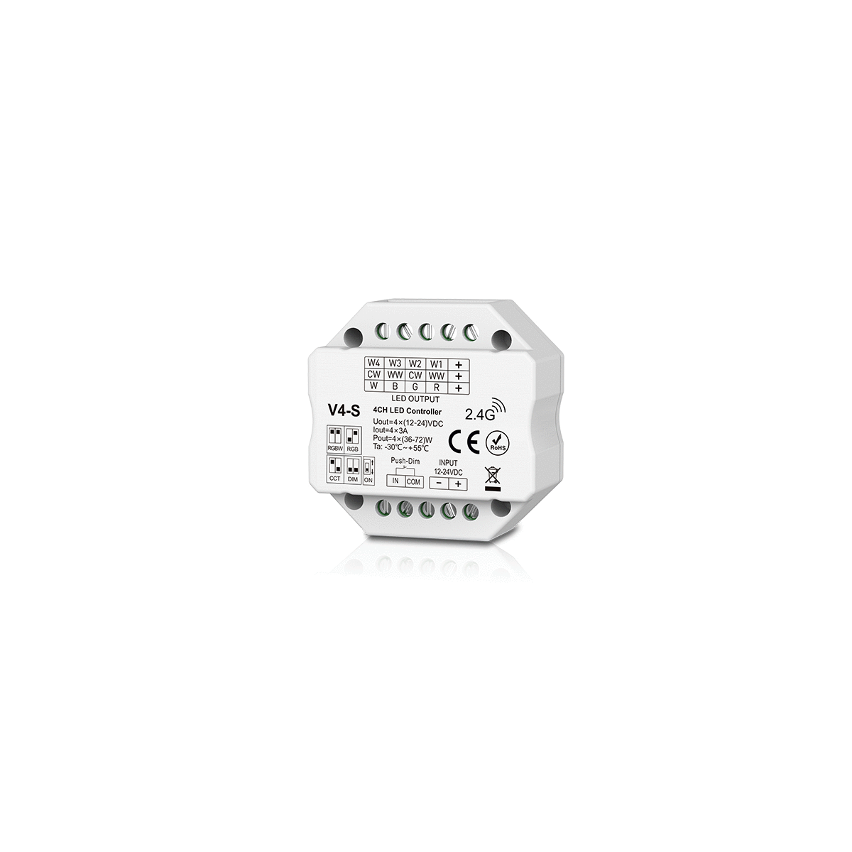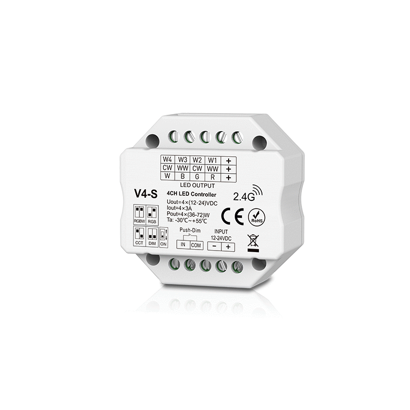 DC dimmer, for a range from 12 to 24V. Ideal for dimming strips, bulbs and any other luminaire operating on DC current. It can be controlled by push button or with a 2.4GHz radio frequency remote control. This device is suitable for dimming single-colour, CCT, RGB and RGBW light sources.