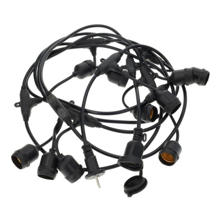 La guirnalda para lámparas con casquillo E27 fabricado en PVC de 5 m de longitud, incorpora un total de 10 portalámparas, con una separación de 50 cm entre cada portalámpara. En los extremos incluye conectores para unir las guirnaldas entre sí, para lograr un mayor longitud. Es ideal para su instalación en el hogar, terrazas, jardines, fachadas, centros comerciales, hoteles, restaurantes o bares.