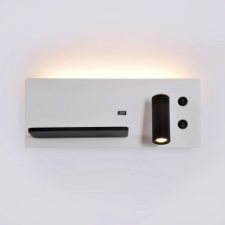 Aplique de aluminio con luz de lectura de 3W y luz posterior de 7W, ambas en luz cálida.