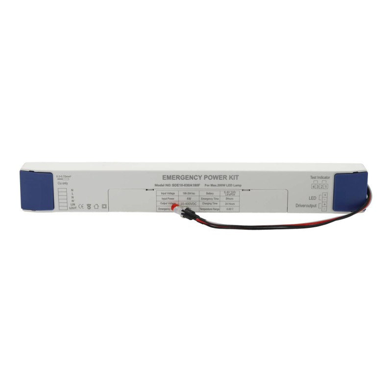 Kit de emergencia ideal para luminarias led de hasta 200W de potencia. Permite mantener una iluminación de seguridad hasta 180 minutos después de un corte de suministro.