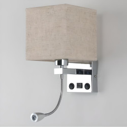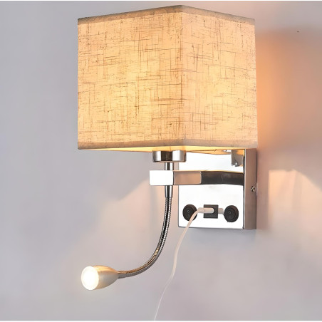 Applique en aluminium avec un abat-jour en tissu avec un culot pour une ampoule à filetage E27. Il dispose également d'un point lumineux LED flexible de 1W en lumière chaude.