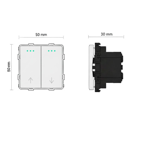 Interrupteur à deux touches pour la commande de stores, disponible en blanc ou en noir. En appuyant sur un bouton et en le maintenant enfoncé, le volet monte ou descend jusqu'à ce que le bouton soit enfoncé ou que le fin de course soit atteint.