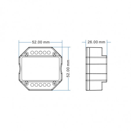 Entrée avec bornes à vis, réglage à la luminosité minimale, petite taille pour pouvoir l’installer dans un boîtier mural standard.
