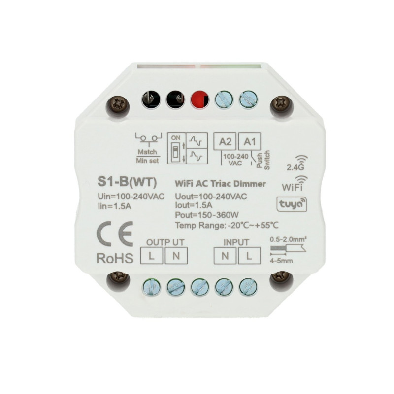 Régulateur pour une puissance maximale de 360 W, pour différents types d'éclairage LED (ampoules, lampes dichroïques, panneaux, bandes, downlights, etc.). Il est également compatible avec les luminaires conventionnels à intensité variable. Il peut être contrôlé à l'aide de boutons poussoirs, de la télécommande RF pour variateur LED ou via WiFi à l'aide de l'application Tuya. Type TRIAC. Ne régule pas le courant continu.