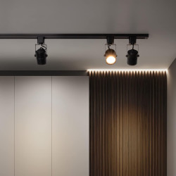 Projecteur de piste idéal pour les lampes/ampoules GU10. Pour les rails monophasés. En aluminium noir.