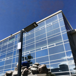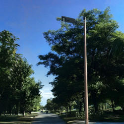 Lâmpada de rua LED alimentada por um painel solar integrado, sem ligação à rede eléctrica.
