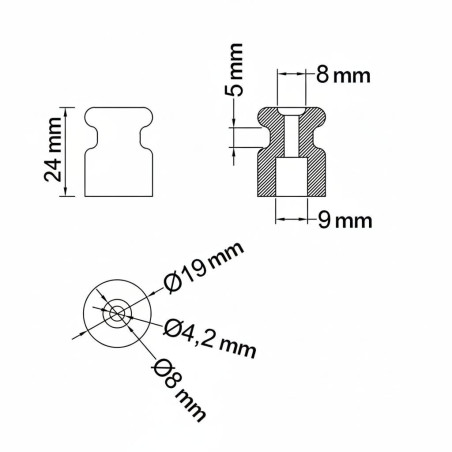 Isolador de porcelana em branco, preto e marfim, com dimensões de 20 x 24 mm.