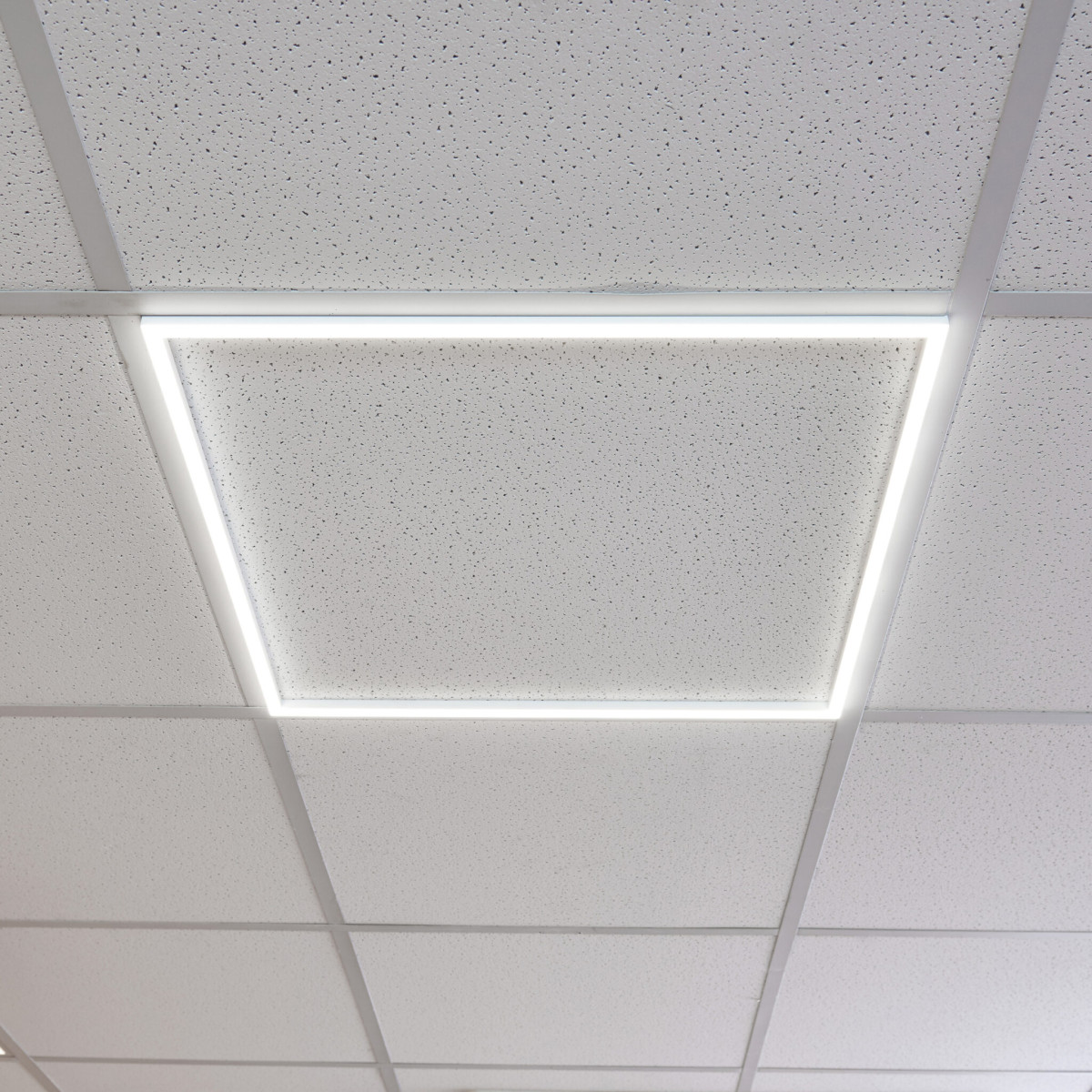 Estrutura LED de 60x60 cm adequada para colocação em teto técnico, permitindo manter as placas de gesso.