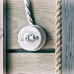 Interruptor de porcelana disponível em branco, preto e marfim com dimensões de 65 x 60 mm.